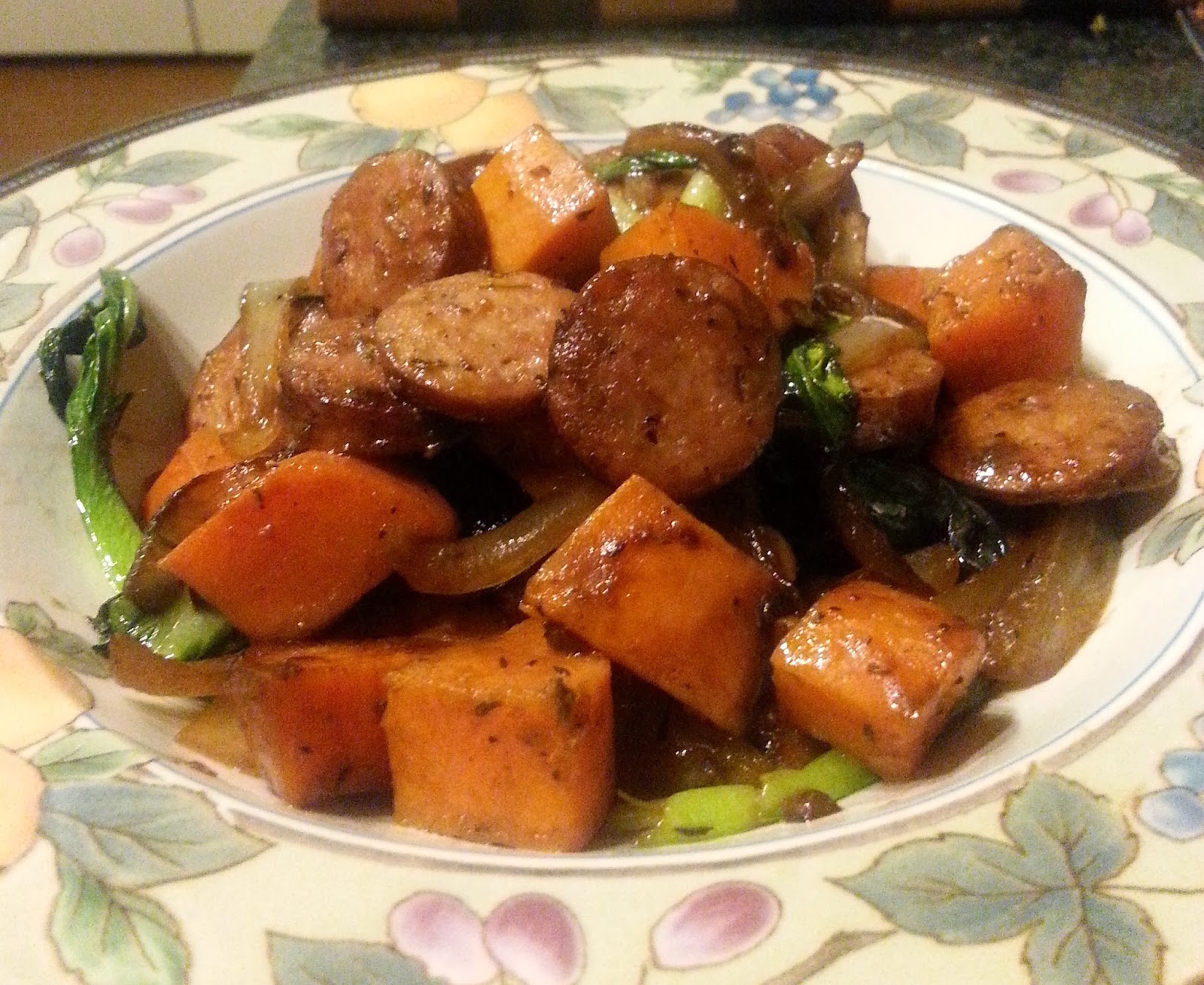 While your potatoes are cooking, heat oil over medium heat in a sauté pan (this is what a sauté pan looks like). Add the onions and allow to cook for 5 minutes. Add in the garlic and the vinegar, and sauté for 3-5 minutes, or until the vinegar has cooked off (there shouldn't be a pool of it in your pan in other words). Add in the kielbasa, potatoes, thyme, salt, dijon mustard, and black pepper. Allow to cook for 5 more minutes, until the kielbasa starts to brown. Add your leafy greens in and cook until wilted and tender. I used baby bok choy that I tore into pieces. I think a couple good-sized handfuls of spinach would work really well instead though. At this point you're ready to eat up a delicious meal! You may want to season with additional salt and pepper (P and I loooove salt but when I make recipes I go with less and then we can season to our tastes when a serving is on our plates).